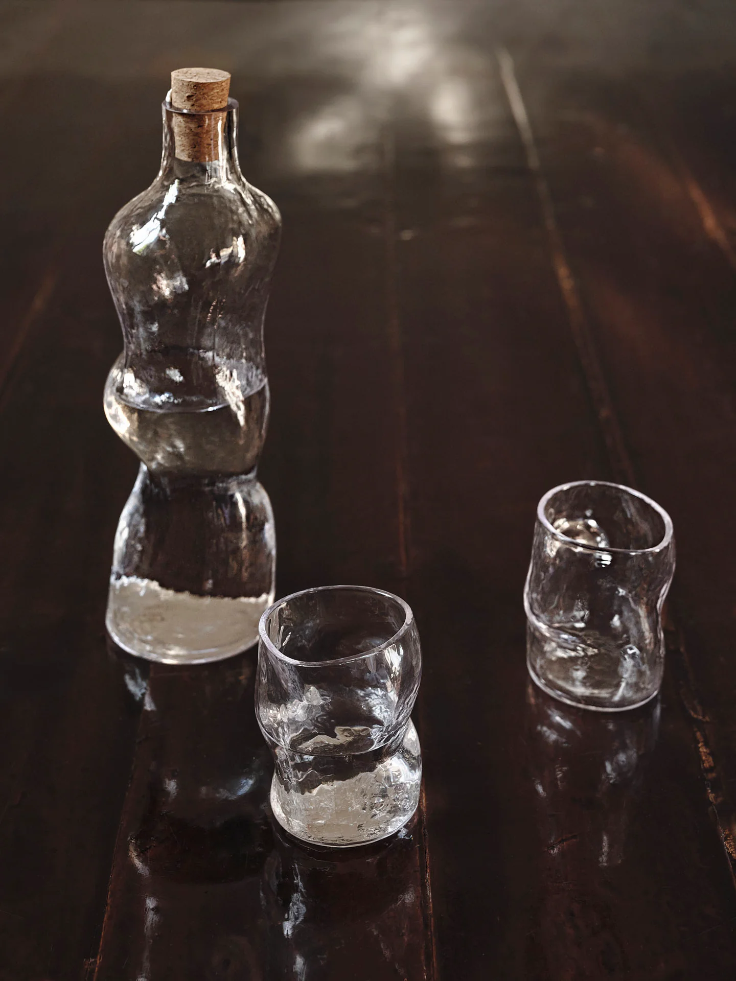 The Dimple Glasses effortlessly spark conversation with their charmingly contoured forms. Inspired by the word ‘dimple,’ meaning ‘a slight natural indentation,’ the glasses feature a sculptural design crafted from solid glass. Their organic, uneven shape mimics the charming contours of facial dimples, while the hammered texture adds depth and character. Perfect for water, juice, or other beverages, the Dimple Glasses instantly enliven any dining experience.